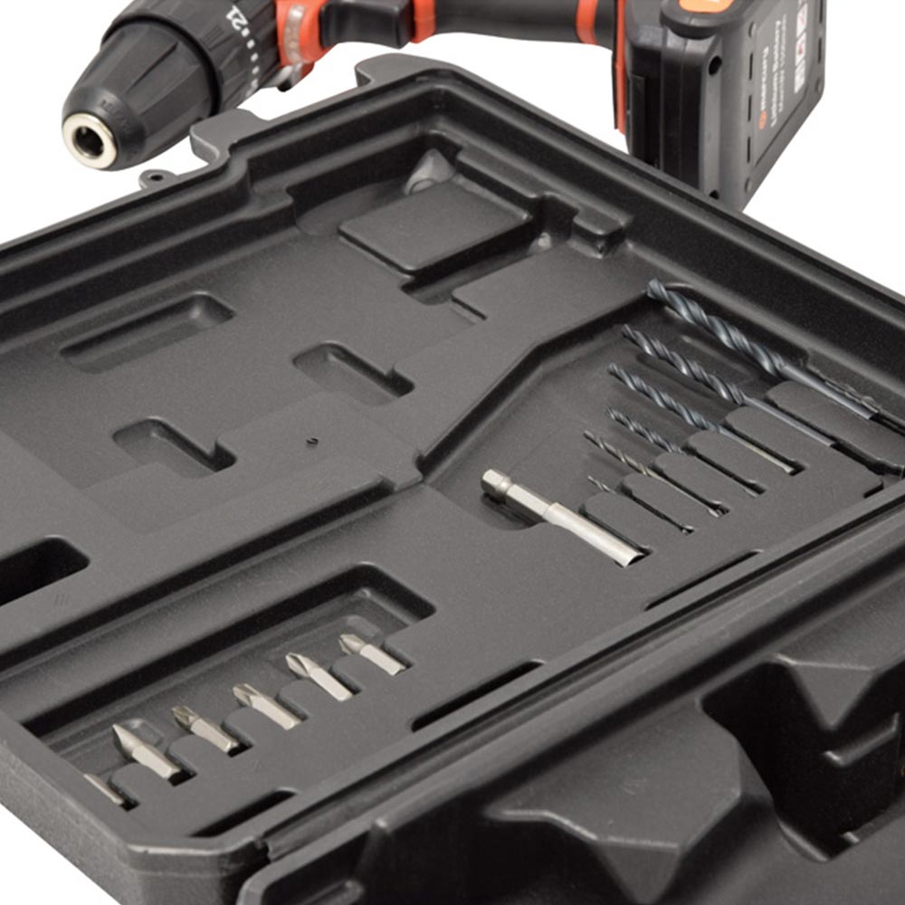 В комплект с куфар, 6 бургии, 6 отвертки + накрайник + батерия